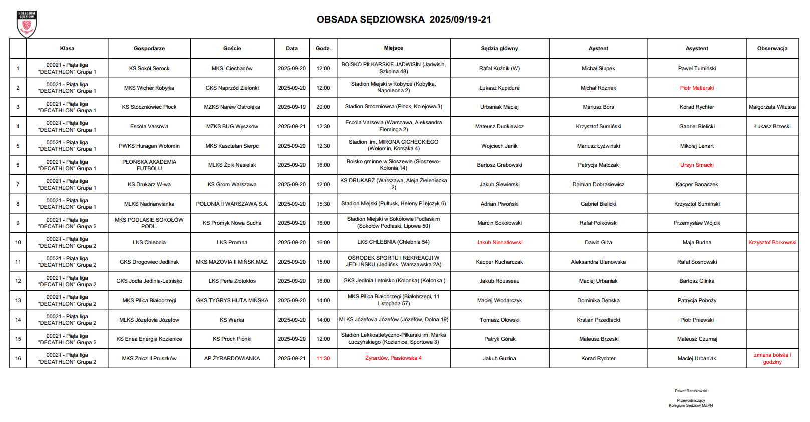 Obsada V liga – VI kolejka – 12-15.09.2025 (aktualizacja)
