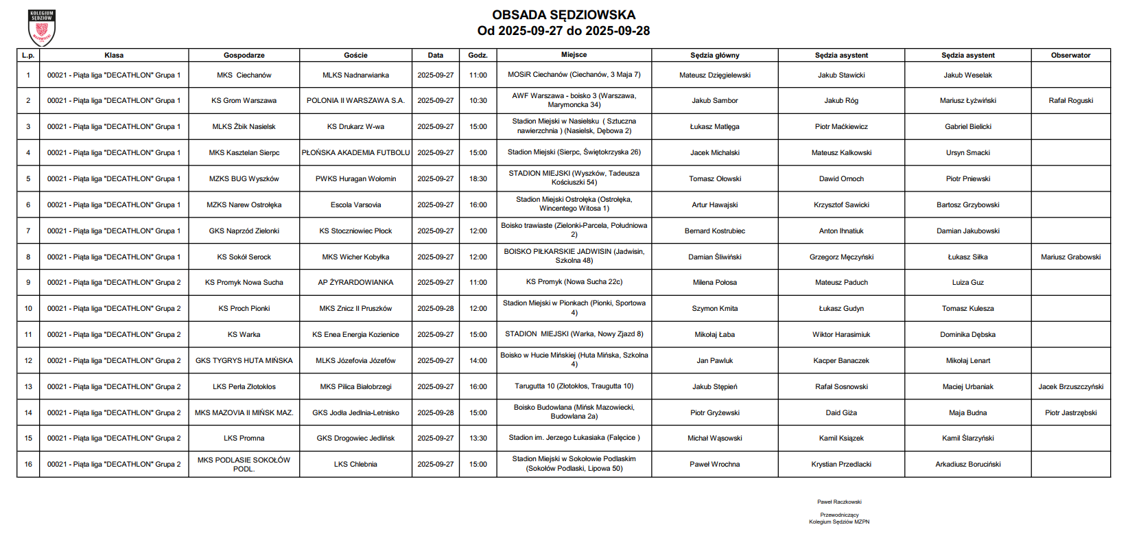 Obsada V liga – VIII kolejka – 27-28.09.2025