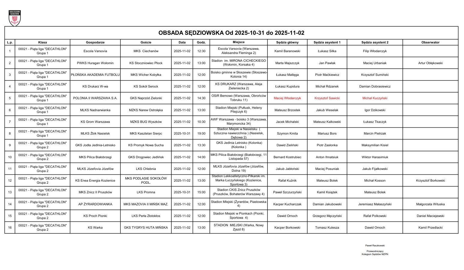 Obsada V liga – XIII kolejka – 31.10-02.11.2025 (aktualizacja 30.10)