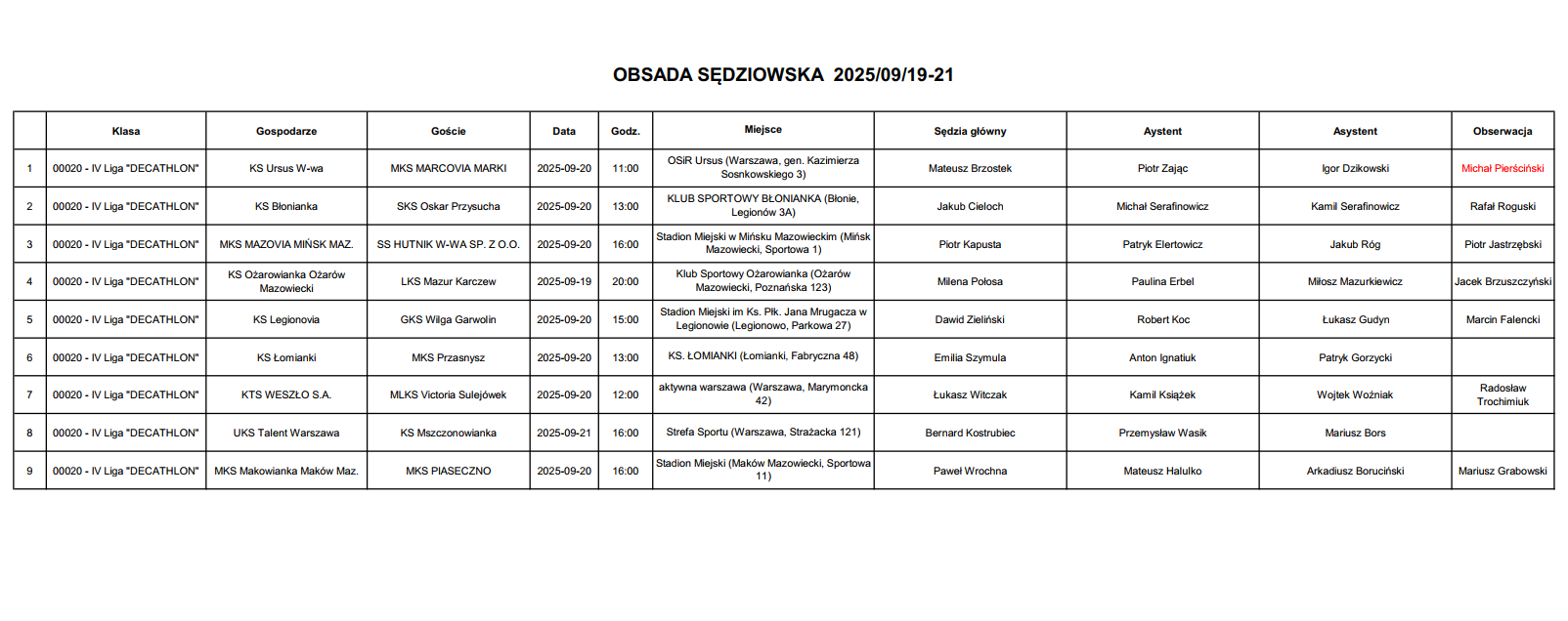 Obsada IV liga – VIII kolejka – 19-21.09.2025 (aktualizacja 19.09)