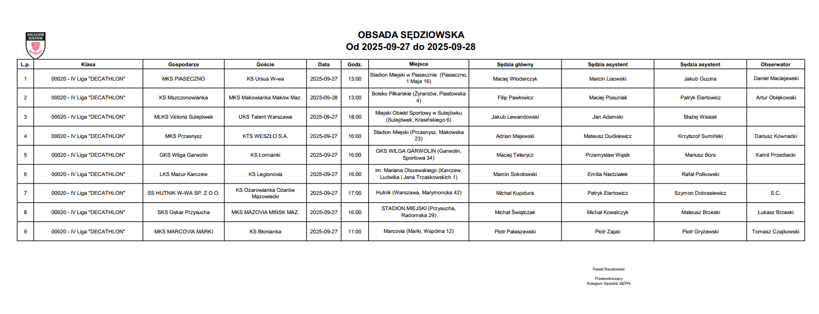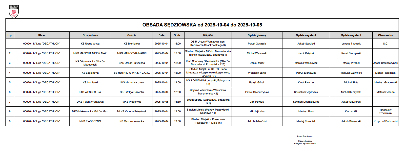 Obsada IV liga – X kolejka – 04-05.10.2025