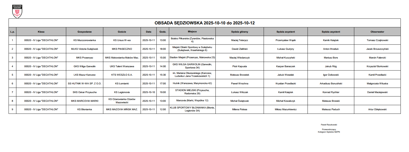 Obsada IV liga – XI kolejka – 10-12.10.2025