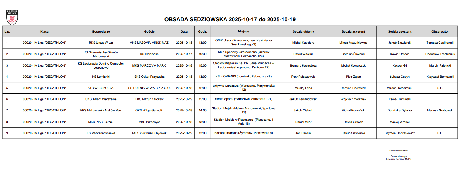 Obsada IV liga – XII kolejka – 17-19.10.2025