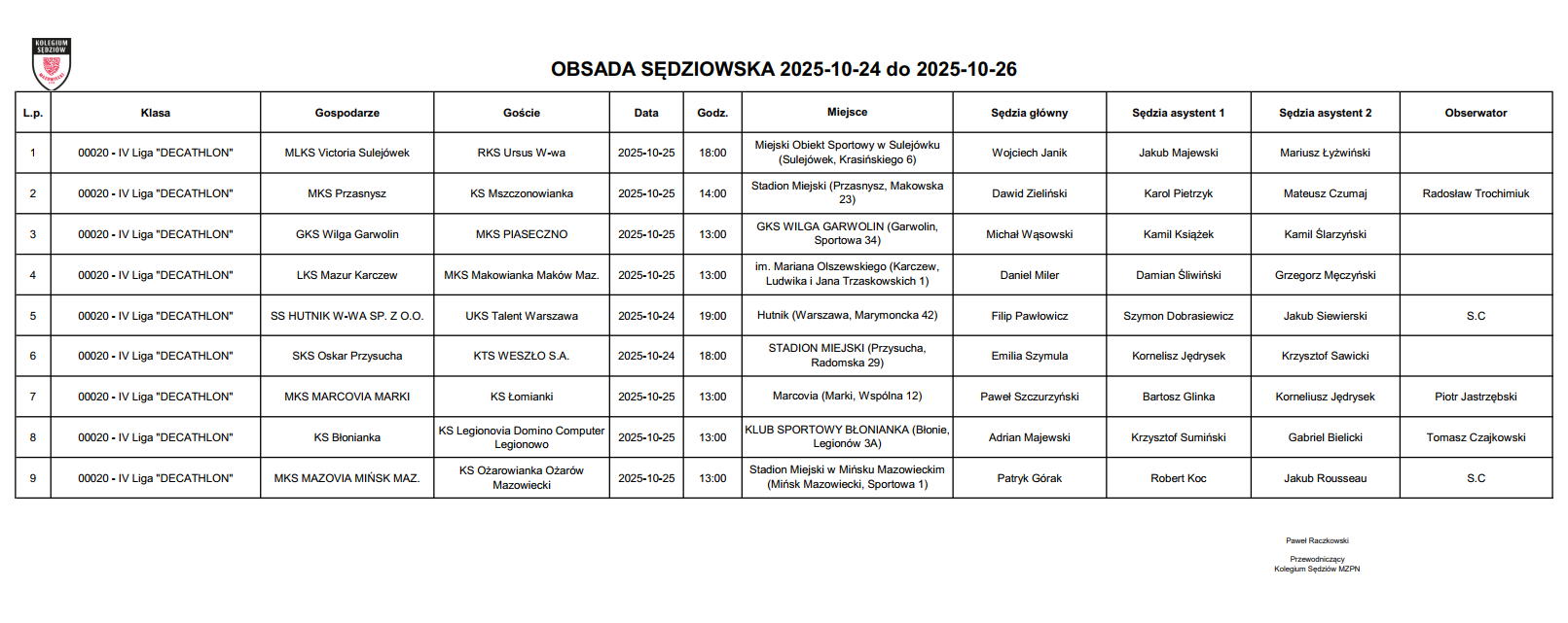 Obsada IV liga – XIII kolejka – 24-26.10.2025