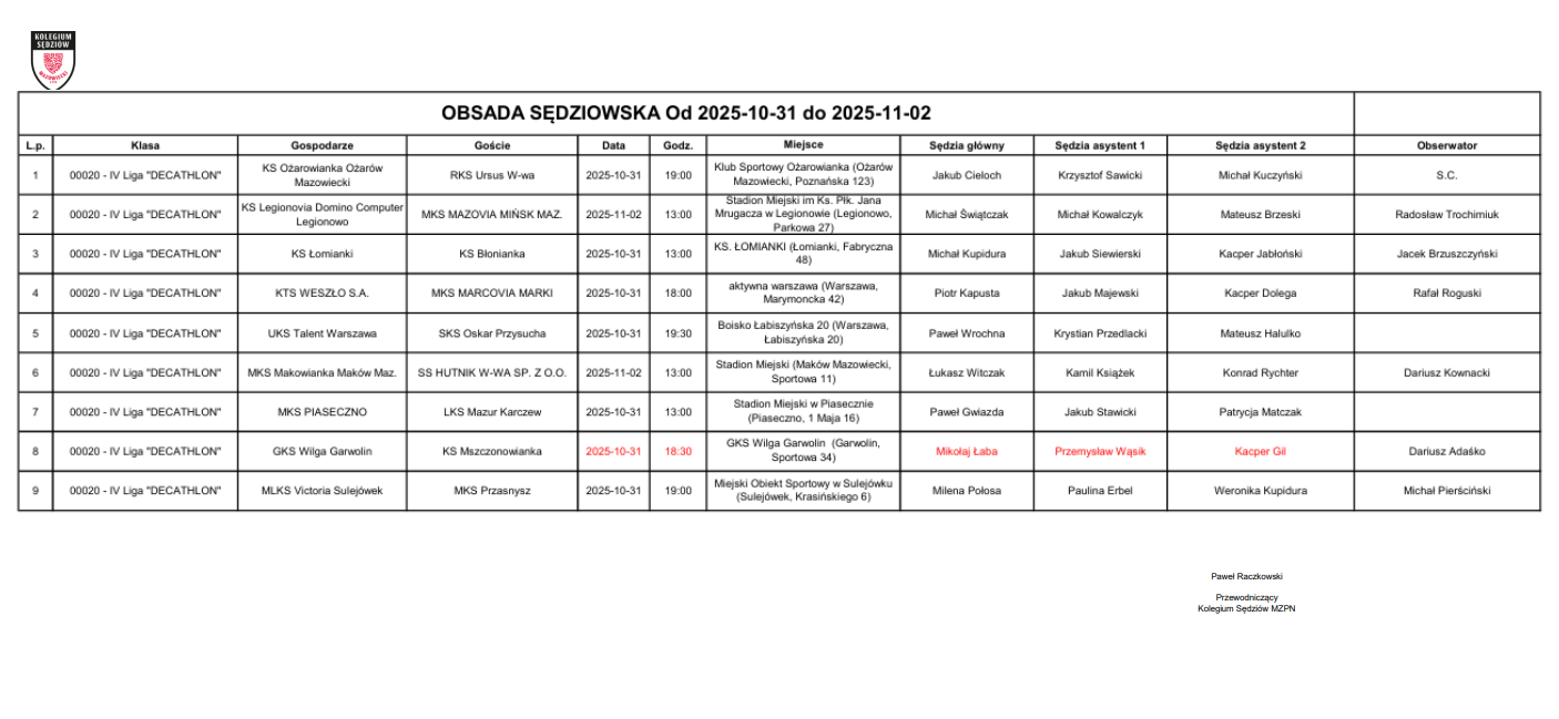 Obsada IV liga – XIV kolejka – 31.10-02.11.2025 (aktualizacja 30.10)