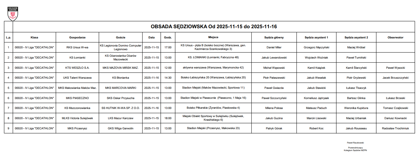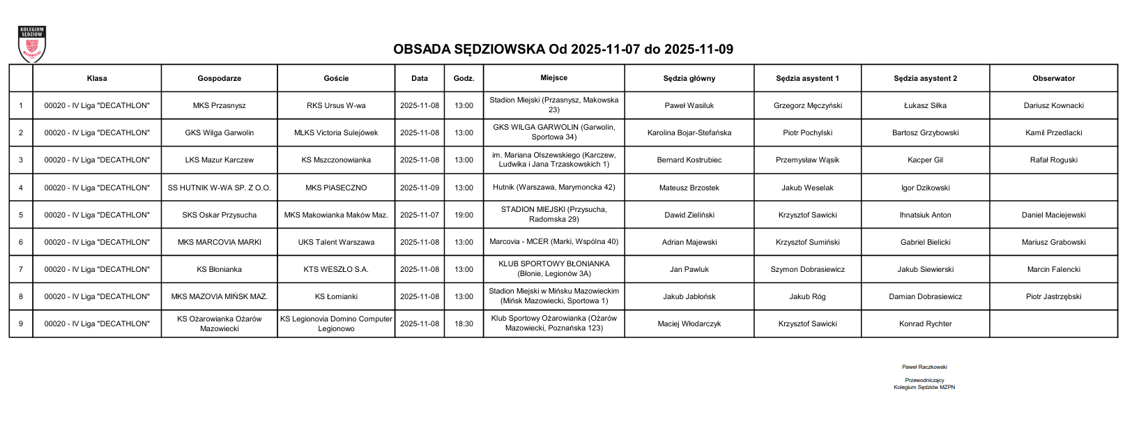 Obsada IV liga – XV kolejka – 07.11-09.11.2025
