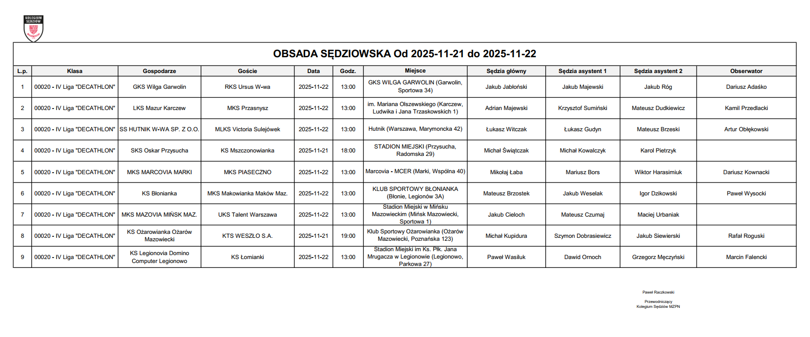 Obsada IV liga – XVII kolejka – 21.11-22.11.2025